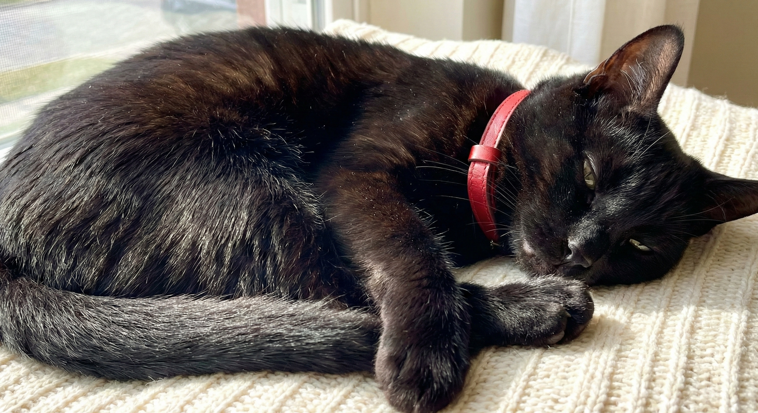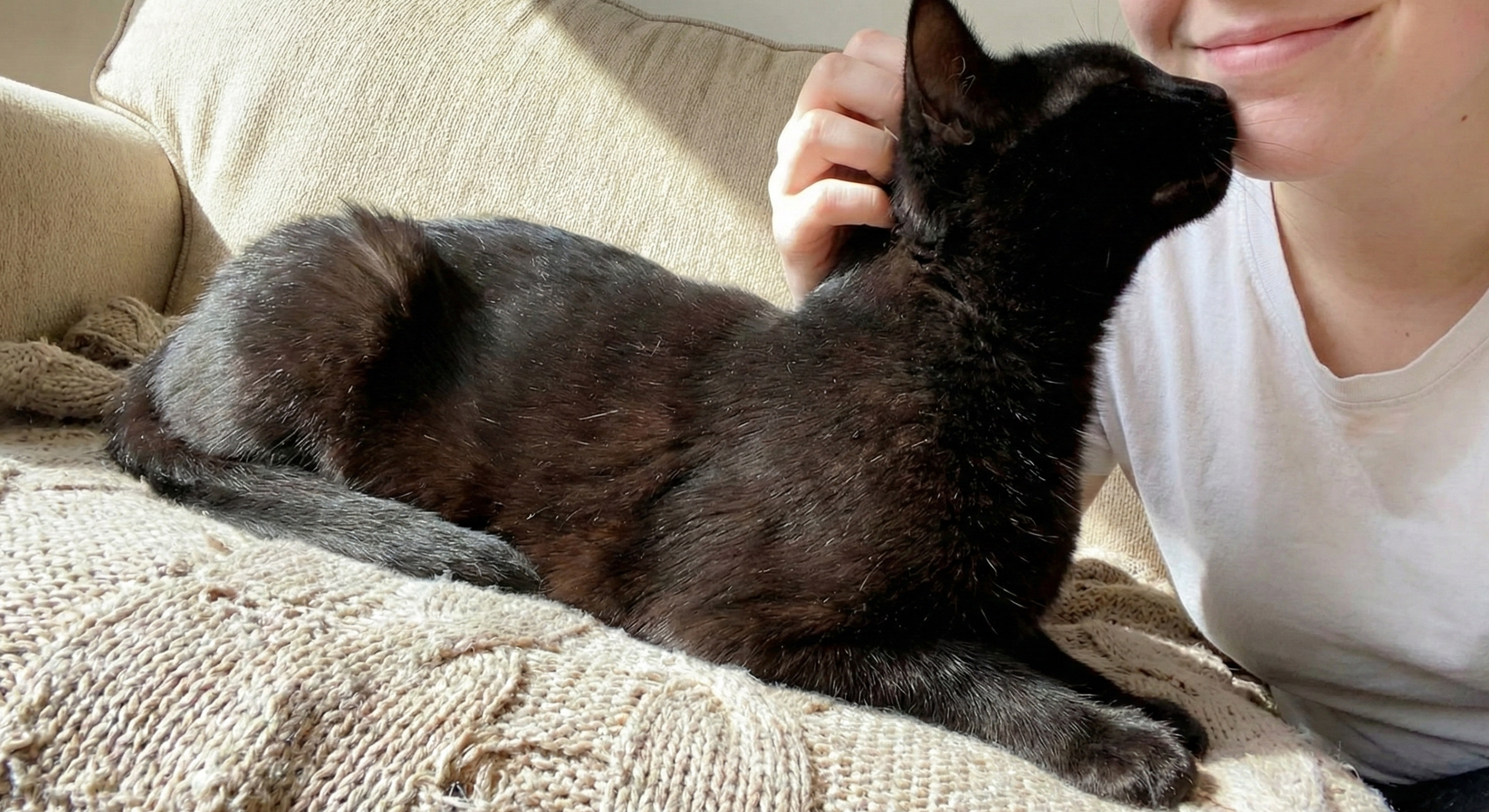 健康な黒猫の毛並みを見たことがありますか? 光が当たると、黒ではなく「天使の輪」のような白い光沢が現れます。 その手触りは、まるで高級なベルベットやシルクのよう。一度撫で始めると、その滑らかさと温かさに癒やされ、手が止まらなくなります。太陽の光をたっぷり吸い込んだ黒猫の背中は、世界で一番温かい場所かもしれません。
