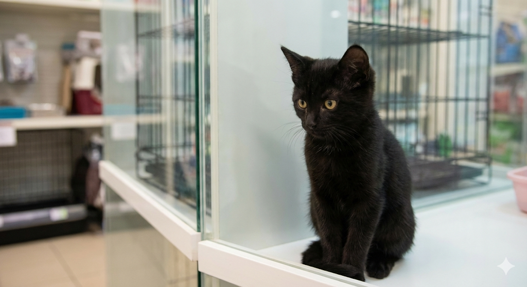悲しいことですが、ペットショップの展示ケース内では、黒猫は顔のパーツがはっきり見えにくく、その魅力が伝わりにくいという側面があります。