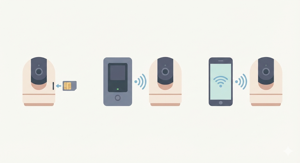 - SIMカード内蔵型モデルの利用スマホと同じように4Gや5Gの電波を使って通信するカメラです。月々の通信契約が必要ですが、置くだけで使える手軽さがあります。